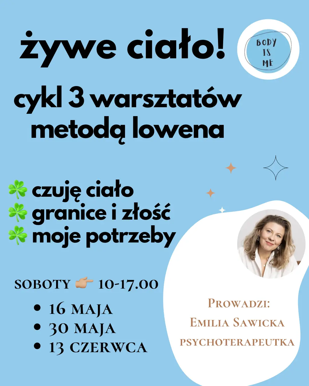 Zapraszam Cię do cyklu ŻYWE CIAŁO – 3 sobót, podczas których pracujemy metodą analizy bioenergetycznej, stworzoną przez psychiatrę i psychoterapeutę Alexandra Lowena . Przez ruch, oddech, dźwięk, kontakt z ciałem i ćwiczenia relacyjne. Odkryjesz, jak ufać temu, co czujesz, jak trzymać się swojego centrum, wyznaczać granice, sięgać po to, co dla Ciebie dobre. Być sobą – bez masek, w uważnej obecności i Twoim tempie.